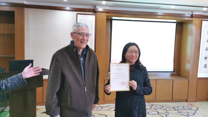 参观结束后,原中科院大连化物所副所长、93岁北大老校友陈庆道将湖北省北京大学校友会的感谢函颁发给讲座主讲人——大连万方私人健康管理中心主任、大连吉大校友会会长宋晓秋,感谢她在年初积极响应北大校友会倡议,为武汉抗疫慷慨捐赠。