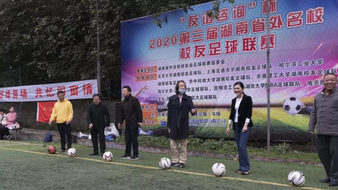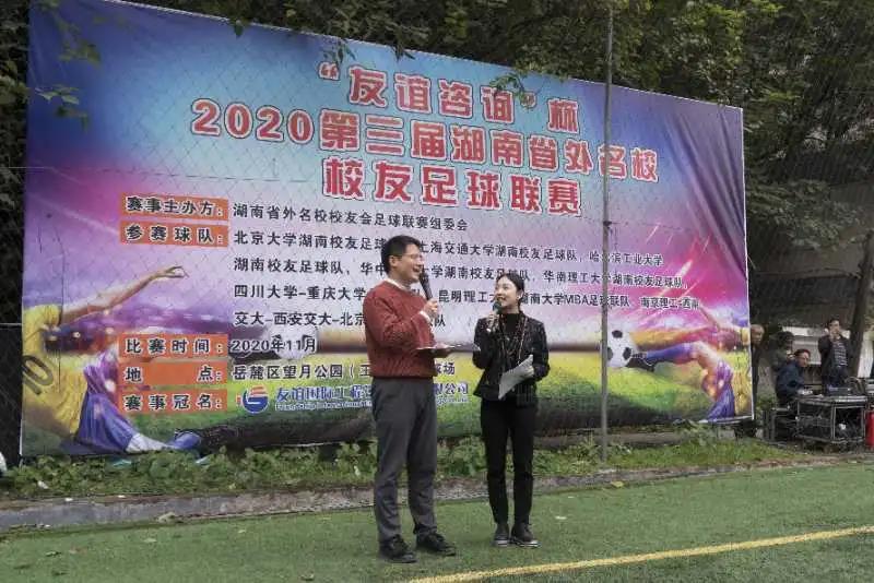 11月1日下午,“友谊咨询杯”2020第三届湖南省外名校校友足球联赛在长沙望月公园(又名王陵公园)球场鸣锣开赛。赛前举行了隆重的开幕式,北京大学湖南校友会会长邓映如和各名校校友会会长、副会长出席。哈尔滨工业大学副会长雷放鸣代表赛事主办方致辞;赛事冠名方代表、友谊国际工程咨询股份有限公司副总裁陈静发表讲话,表示希望携手名校校友,共创伟业;李战生代表球员宣誓。开幕式由友谊咨询市场部经理万湘和北大湖南校友会金牌主持刘宗强共同主持。