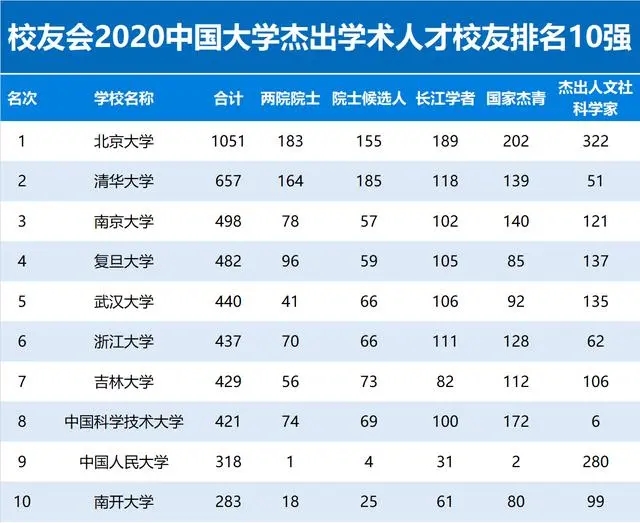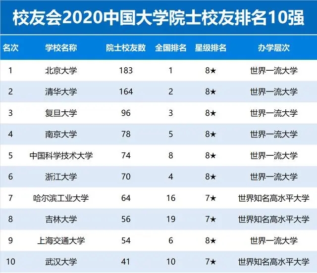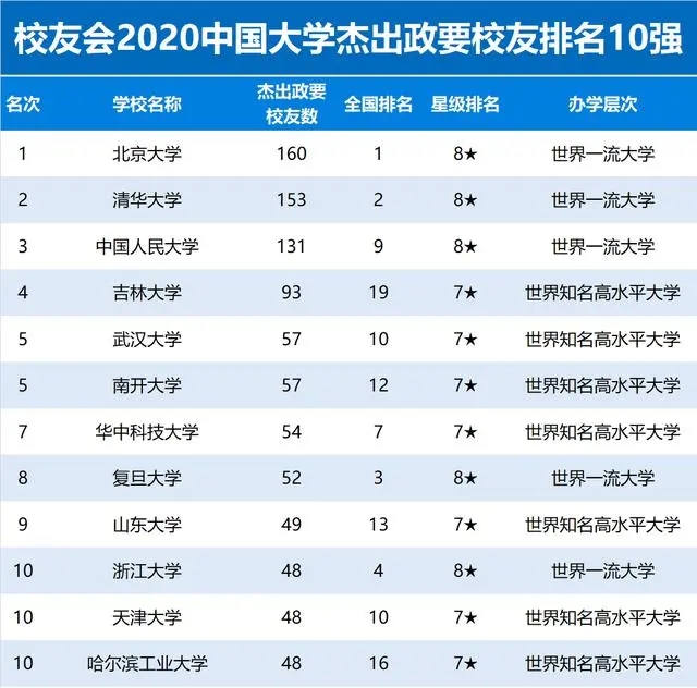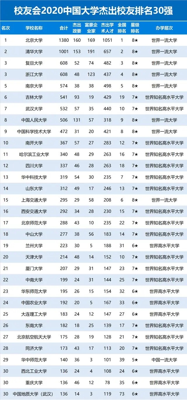 值得关注的是,北京大学、清华大学培养造就的中国政商学界杰出人才最多,雄居2020中国大学杰出校友排名冠亚军,堪称“中国政商学界杰出人才摇篮”;复旦大学、浙江大学并列第3,南京大学第5,吉林大学跻身前6强,南开大学第10。安徽师范大学、西南政法大学、湖北大学、山西大学和东北财经大学等双非大学超出部分“双一流”建设高校,跻身全国100强。