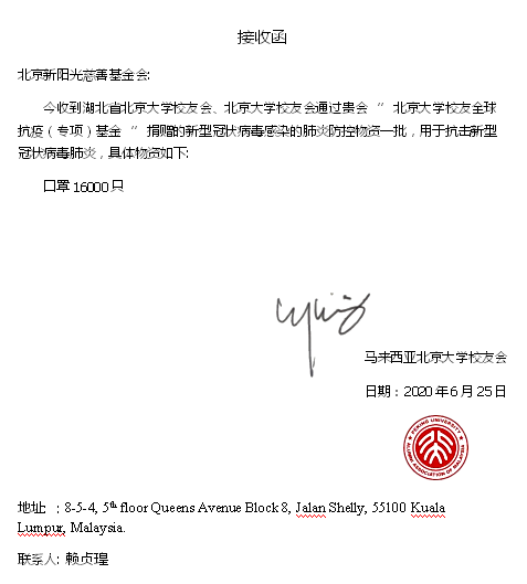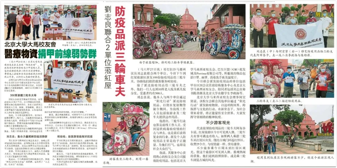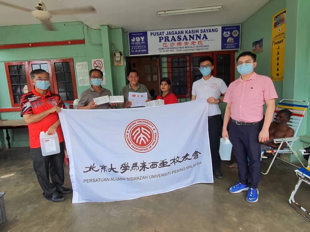 2020年6月27日,北京大学马来西亚校友会将其捐赠的16000只医用口罩发放给了马来西亚华社研究中心、陈嘉庚基金会、林连玉纪念馆以及马六甲一线从业人员和当地三轮车夫等弱势群体,“北大校友”成为当地群众和媒体的称赞的热词。