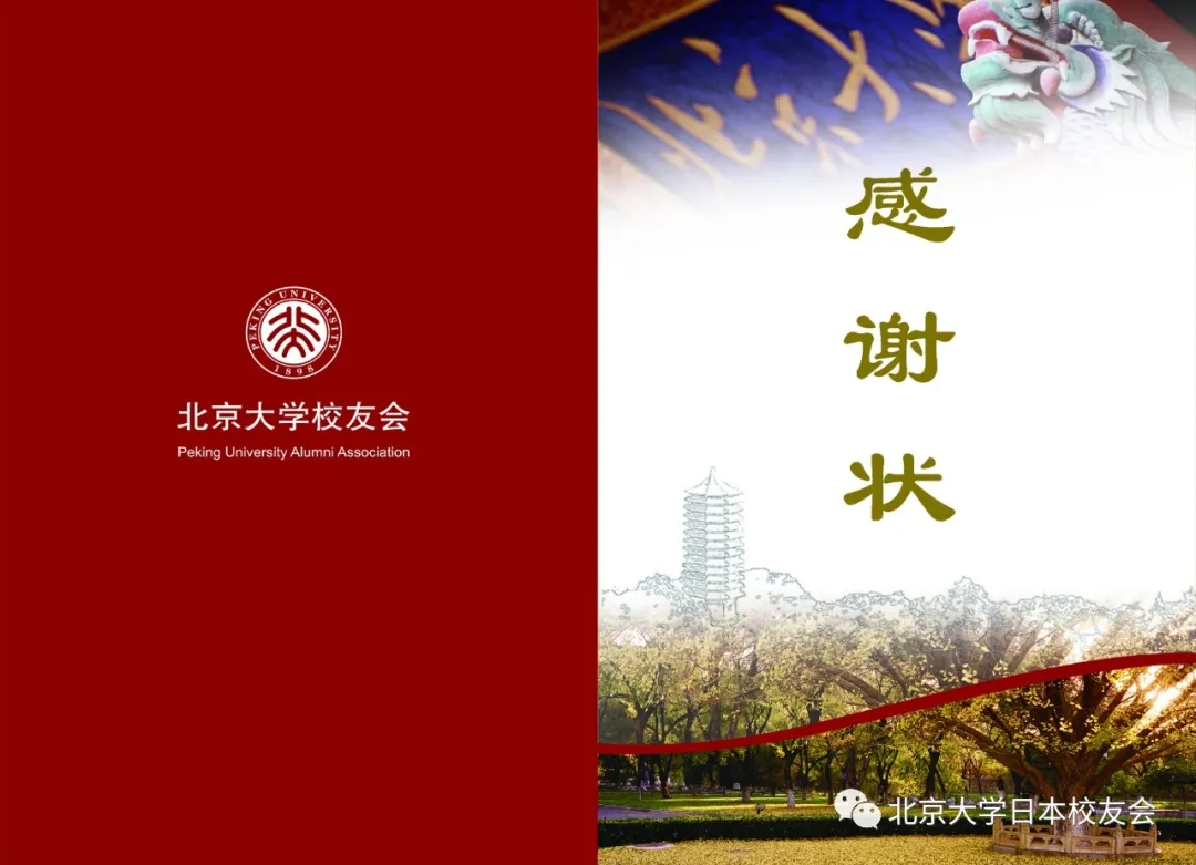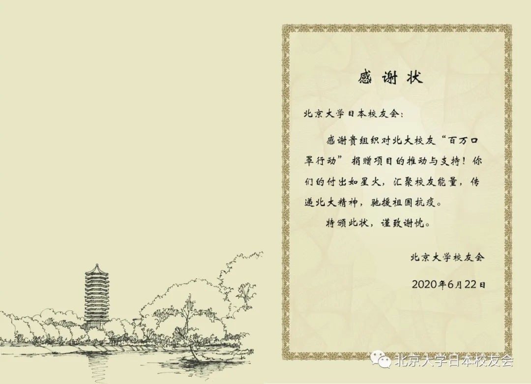 北京大学校友会日前发来感谢状,感谢在日校友向武汉寄赠口罩。感谢状全文如下: