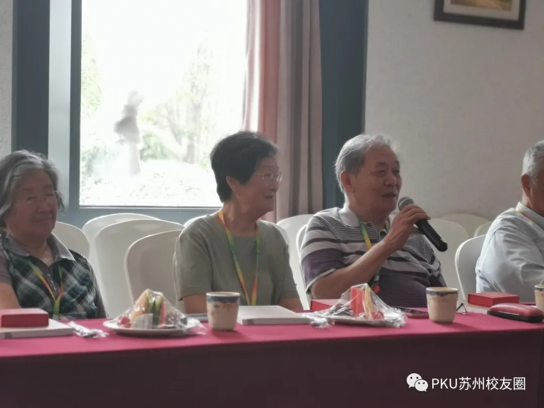 目前来自山东、北京、上海、美国等地的11位校友,其中4对伉俪,他们在考察比较各地养老机构后,选择了吴园休养。老校友们介绍了自己人生经历和从事的工作,他们当年分别就读于北大物理系、地质系、中文系、化学系、北京医学院。除了中文系张炯学长滞留北京,医学院学长赵淑兰因故未出席外,其他学长均参加了会议。