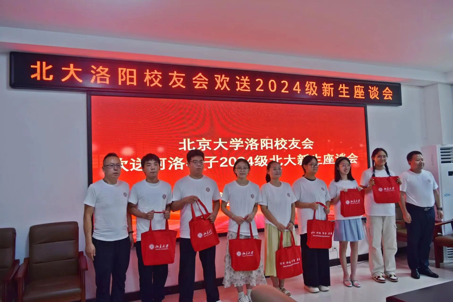 2024年8月10日,北京大学洛阳校友会欢送河洛学子2024级北大新生座谈会在栾川县第一高级中学举行。北京大学河南招生组副组长李平原,洛阳市社会科学界联合会副主席吴颖华,洛阳市教育局教师发展中心副主任王定国、高中部主任白红旭,北京大学洛阳校友会负责人及校友代表,洛阳市7名2024级北大新生及家长、有关中学领导参加座谈。