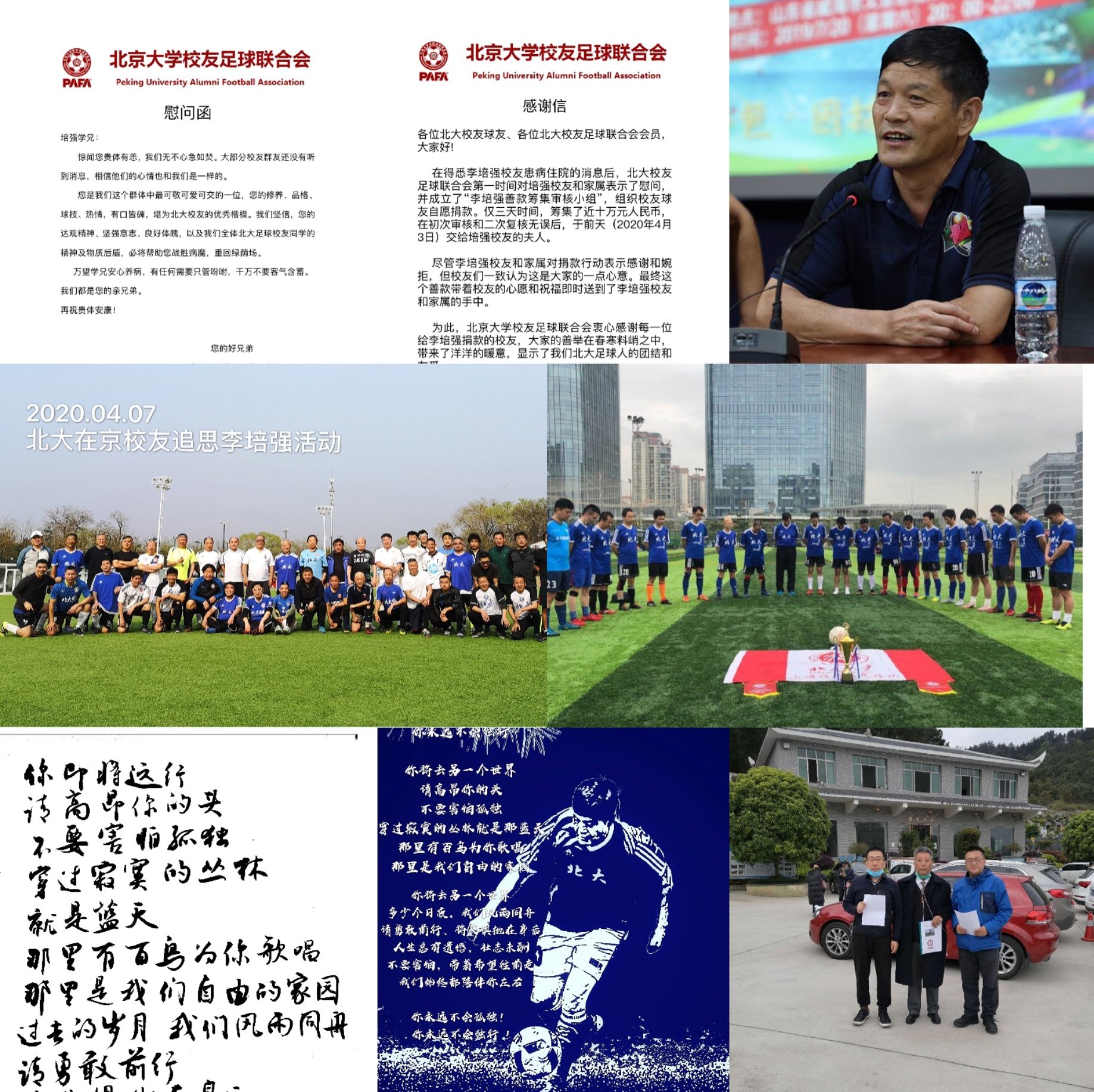 五、在3月份,北大校友足球联合会获悉最年长的、平日参加校友足球活动最积极的、67岁的88级国政系李培强校友,罹患胰腺癌(晚期),北大足联在王惠德和张万中两位校友的组织下,建立“慰问关怀培强工作组”,由足联常务副会长陈谷(82经济)迅速撰写并以足联的名义发出给李培强校友的慰问信,鼓励李培强校友坚定信念、战胜病魔,并表示我们全体北大足球校友都做他的坚强后盾。李培强校友和家属接到慰问信之后,感受到北大和校友浓厚的情谊和关怀,精神受到极大的鼓励和支撑。李培强校友入院后,在贵阳工作的96中文的陈龙受足球联合会的委托到贵阳中医院附属医院看望了他,带去了校友们的真切关心,也让焦急中的校友们及时了解了李培强校友的患病情况。鉴于李培强校友严重的病情、刻不容缓,北大校友足球联合会迅速出台了《李培强学兄慰问金募集管理办法》,在全球北大足球校友的范围内为李培强校友的爱心捐款,同时建立了以足联副会长江岑(91数学)、副秘书长杨忠(86无线电)为组长的出纳小组,以常务副会长陈谷(82经济)、秘书长马庆(84哲学)为组长的会计组、以足联副会长王辉(80法律)、理事袁刚师兄(78无线电)为组长的审计小组的“三级审核制度”,保证了募集工作的合法有序和公开透明。在金雪舟(87中文)、郑文(86英语)、赵为(84计算机)、夏远舟(06金融硕)、陈继伟(85经济)、覃白浪(86计算机)、徐辉(98数学)、江岑(91数学)、杨忠(86无线电)等校友冲在第一线接收统计慰问金、忙前忙后,在很短时间内就募集近十万元捐款,并由足联副秘书长张清校友(84法律)及时送达李培强校友。特别令人感动的是,这次慰问金的募集在得到了以曹图强(81地质)、王新力(82地质)、王卫东(79地质)等为代表的一大批海外足球校友的大力支持和帮助,使在病危中的培强校友感受到格外的温暖和欣慰。培强校友病危期间,金雪舟(87中文)、杨忠(86无线电)组织了医疗群,田刚82协和/医预、张洪涛87生物、胡晶晶91协和/医预等国内外一流的校友医学专家积极诊断联络资源献计献策,令人动容。怎奈恶性癌症格外猖獗,李培强校友不幸离世,北大校友足球联合会在接到消息当天,第一时间向全体足球校友发出讣告,并向其家属发出情真意切的慰问信,随后北京、天津、大湾区、四川、广西等地的足球校友以赛前默哀、诗歌朗诵、追思会等不同形式对培强校友的辞世表示哀悼,王豫刚(84经济)、关毅(84法律)校友为培强校友的墓碑制作提供了图、文设计,碑文由金雪舟(87中文)书写,由北大校友足球联合会副会长江岑(91数学)和理事缪执中(79地理)、潘新国(81力学)三位校友作为代表,赴贵阳参加了李培强校友的葬礼仪式。病魔无情人有情,通过一系列的动作,北大校友足球联合会继承了北大的爱护校友的好传统,充分体现了校友、球友的深厚情谊,也检验了作为一个团结向上、互助友爱的群体的凝聚力。