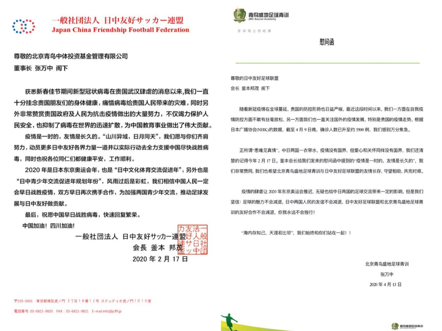 张万中校友与日中友好足球联盟会长釜本邦茂在疫情期间互致的慰问函