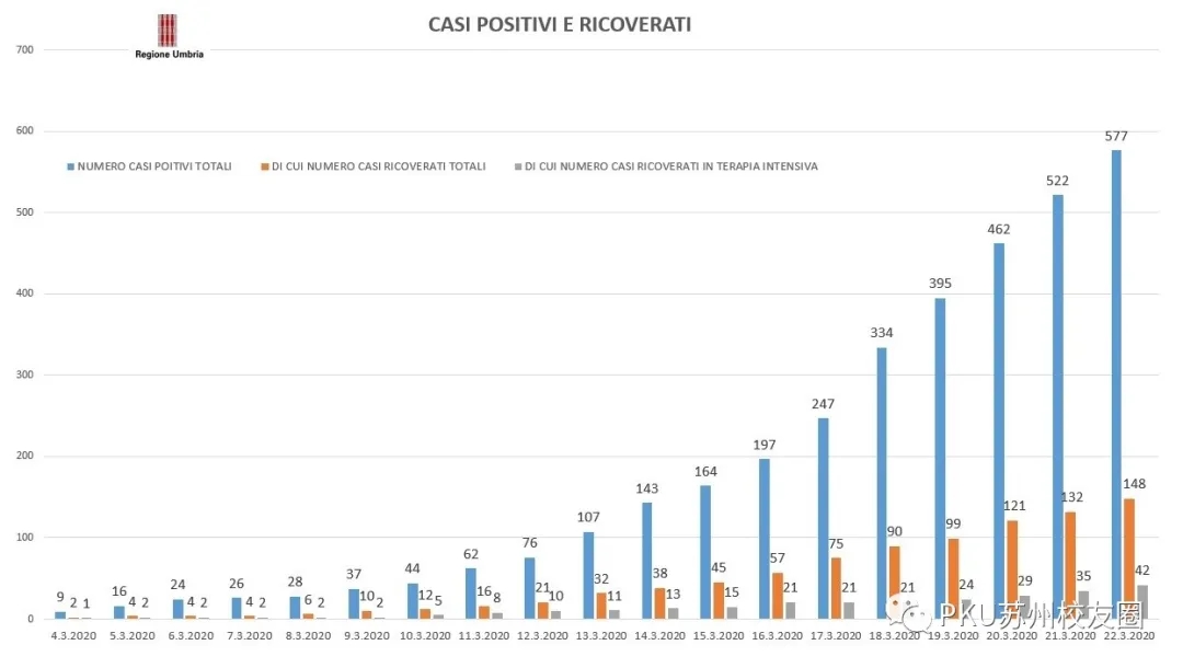 而在意大利内部,情况则更加复杂,我们比较熟悉的米兰,罗马,由于国际知名度高,国际物资援助相对比较多,而在没有什么国际知名度的地区,比如翁布里亚(Umbria)地区,则几乎没有国际捐助的声音能够到达。Umbria地区仅有88万人口,但是已经有648人感染,平均每天都增加70个左右(相比之下江苏的总感染人数是638),本地政府和医院的物资已经彻底枯竭,医生和护士已经用不上医用外科口罩;而Umbria地区的检测能力也非常有限,本地几乎没有更多检测能力,无法对疑似患者进行检测和针对性隔离。