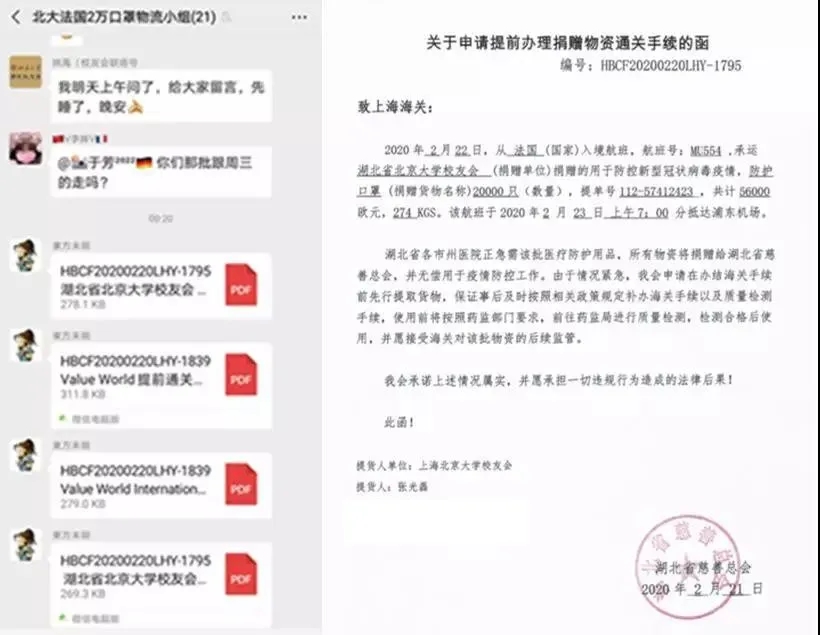2月21日,为了尽快运抵这批货物,在北京大学校友会的统一协调下,法国校友会、上海校友会、德国校友会、香港校友会和湖北校友会组成了接力运输通道。湖北省慈善总会也给予大力支持,专门向上海海关发函,为校友会申请提前办理捐赠物资通关手续。22日,带着北大人的深情厚谊,带着无数志愿者的辛勤汗水,带着对抗疫前线医务人员的关爱,这批N95口罩踏上了飞往武汉的路程。