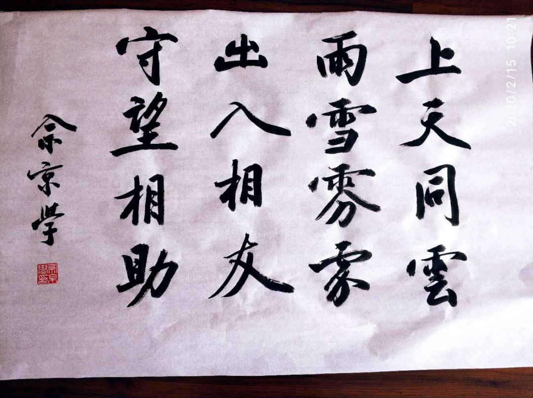 我拟的词句原本是“上天同云,雨雪雰雰;出入相友,守望相助”,前半句出自《诗经·信南山》中周天子祭天祈福的话,后半句出自《孟子·滕文公上》,是孟子讲的做人亲睦的道理。