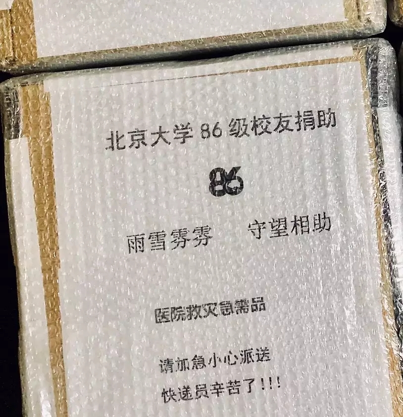 2020年2月15日,北京降下雨夹雪,雨雪霏霏。冒着雰雰霏霏的大雪,北大86级校友向新冠疫区捐赠的5台呼吸机从北京发出,驰援武汉。疫情紧急,北大86级校友在行动。