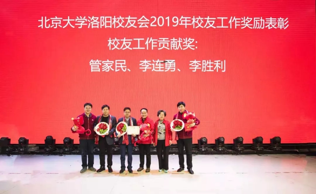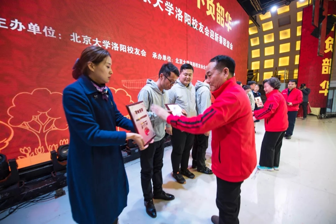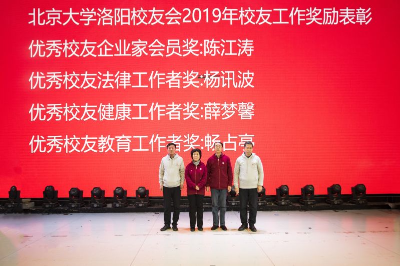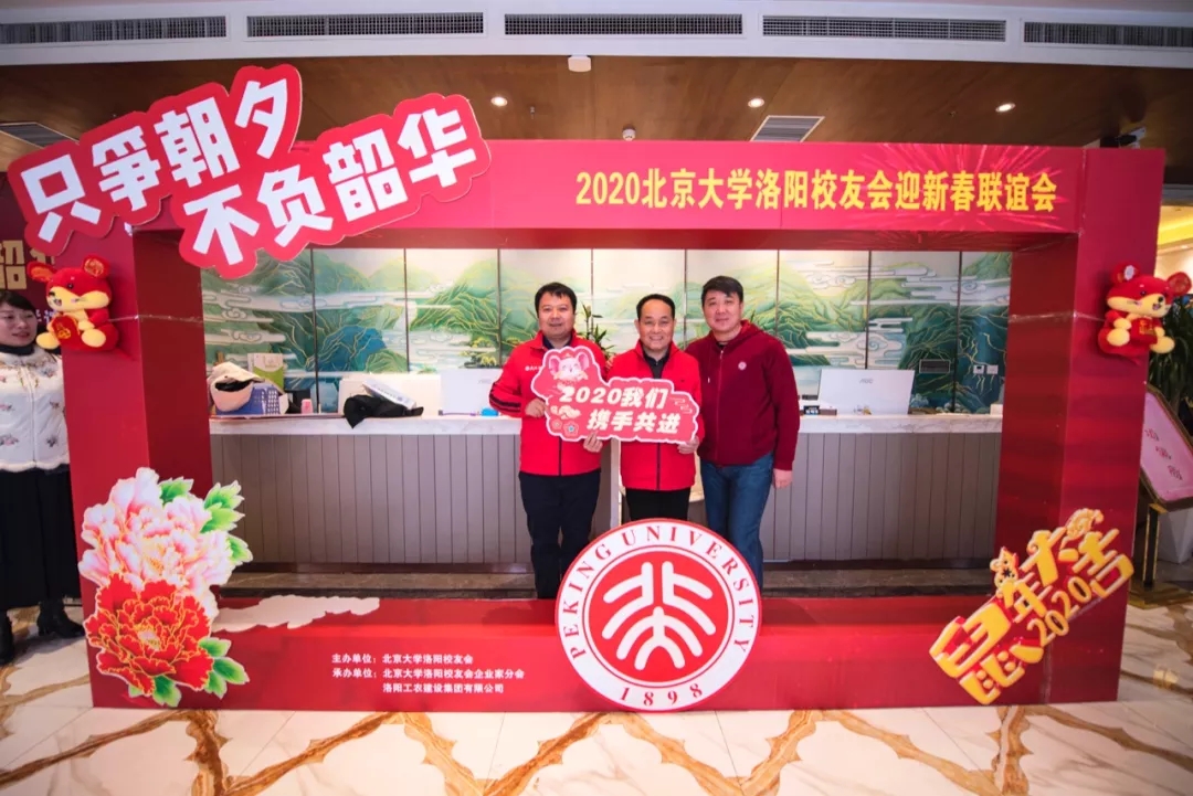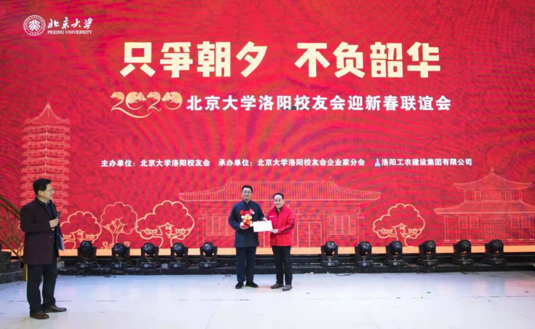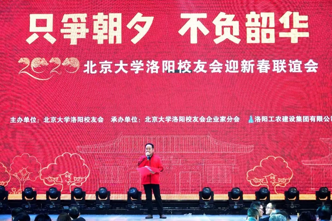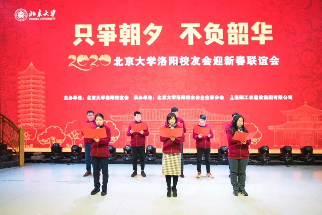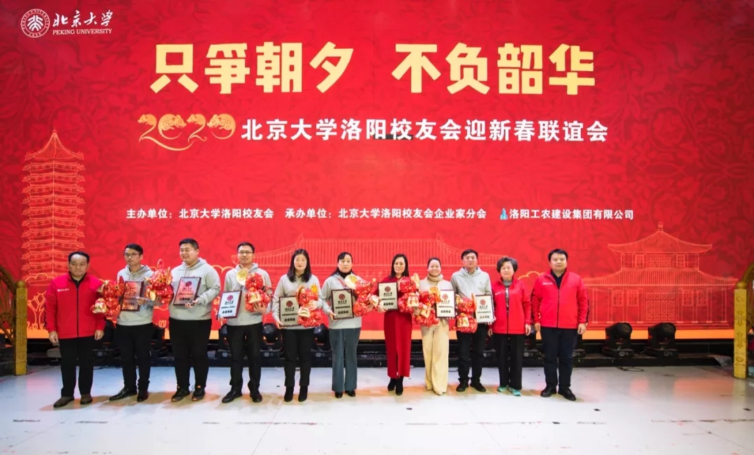 金猪辞旧岁,玉鼠迎新年。2020年1月12日下午,洛阳新区宴江南宴会厅流光溢彩,富丽堂皇。2020北京大学洛阳校友会颁奖典礼暨迎新春联谊会会场高朋满座,喜气洋洋。“只争朝夕 不负韶华”显得格外醒目。北京大学学生工作部副部长、北京大学中原发展研究会指导教师王欣涛博士,北京大学国学教授、博雅俊商学院副院长王碧波老师带来了母校的厚爱,北京大学新疆校友会副会长、代理秘书长聂宁送来了学长的深情。洛阳市政协秘书长张丽君、洛阳市社科联副调研员宋红伟、民政局社会组织党委副书记李建超、洛阳市工商联副主席张义伟、洛阳市政务服务和大数据管理局副局长曾映东、洛阳市统计局副局长李国强、洛阳市商务局副调研员宋中明、高新区创业中心主任黄丁丁、洛阳市国家大学科技园总经理孙少波、洛阳市书法协会名誉主席李进学等领导的莅临凝聚了多年来始终如一的关心,清华大学洛阳校友会、交通大学洛阳校友会、哈尔滨工程大学洛阳校友会、西北工业大学洛阳校友会的代表无不透着兄弟般的情谊。向北京大学输送了优秀学生的洛阳市第一高级中学、汝阳县第一高级中学、孟津县第一高级中学、东升二中、洛龙区第一实验小学等代表学校的校长与北京大学洛阳校友欢聚一堂,北大研究生会和北大洛阳校友会为洛宁董寺村小学捐建的“润知图书馆”,朗朗读书声的学生们成为河洛北大人时时牵挂在心的重要嘉宾。洛阳市律师协会、洛阳医学会、洛阳老子学会、洛阳市孔子学会、洛阳市女性学会让晚会增添了温馨的春色。