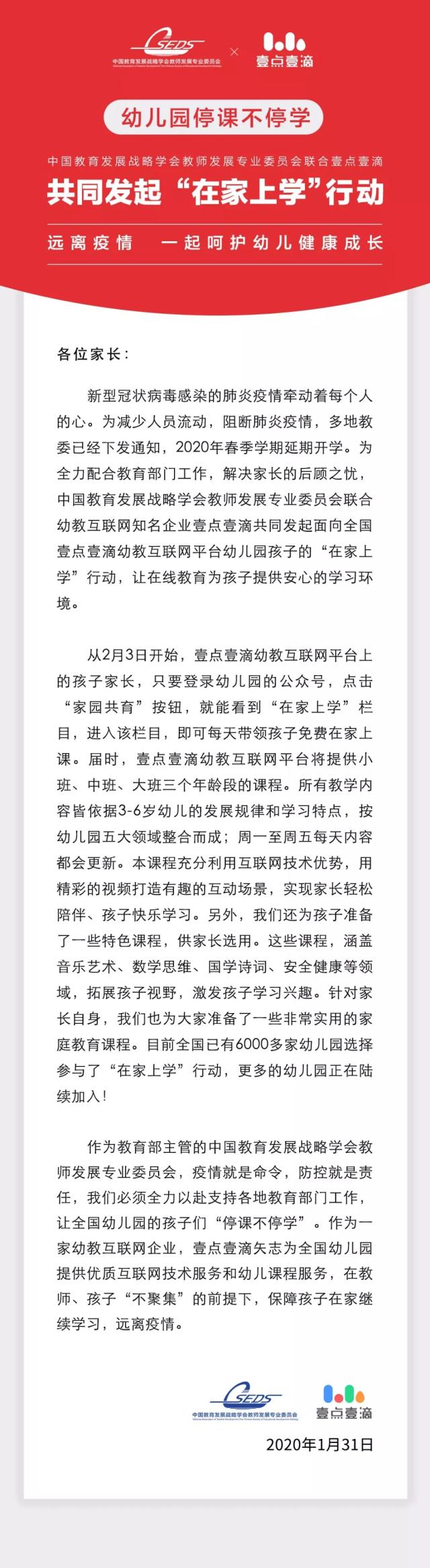 壹点壹滴总裁张缪兴参与北大青年CEO俱乐部理事内部捐款。2月3日开始,壹点壹滴为平台所有幼儿园紧急发起“三大行动“:面向幼儿园孩子的“在家上学”行动,助力壹点壹滴幼教互联网平台的园所“停课不停学”;助力平台所有老师在家读“幼师学院”,完成新学期所需的专业储备;为园长们开设“园长商学院”,让园长们足不出户,也能百战归来再读书。
