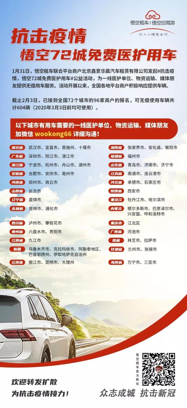 1月31日,悟空租车发起“抗击疫情,悟空72城免费医护用车”公益活动,为一线医护单位、物资运输、媒体朋友提供无偿用车服务。