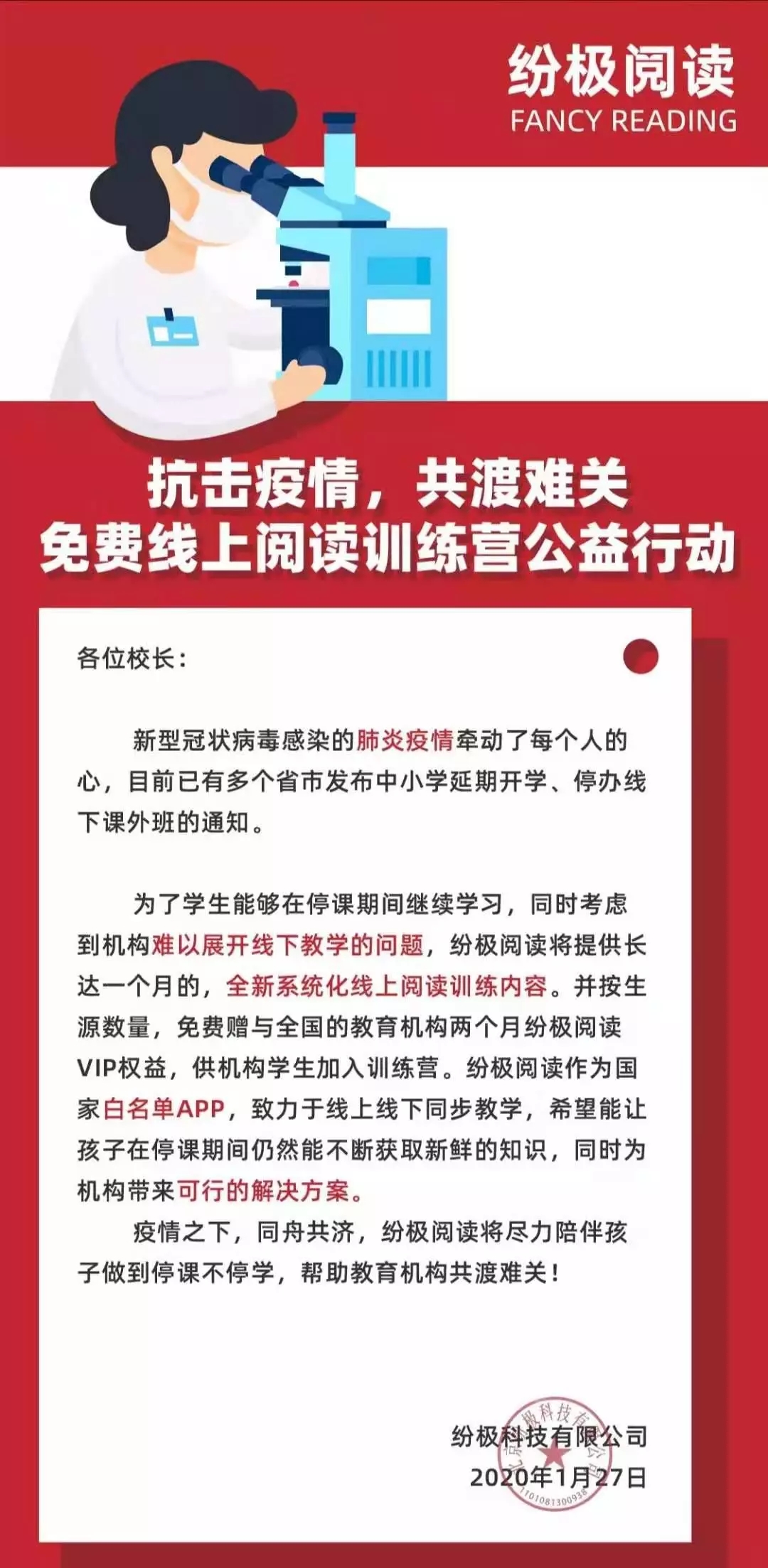纷极阅读开展免费线上阅读训练营公益行动。向全部小学阶段培训机构免费提供纷极阅读App会员账号;免费提供线上语文阅读训练营内容;免费提供线上培训帮助机构伙伴开展线上阅读训练营,助力机构在停课期间拥有可行的解决方案。