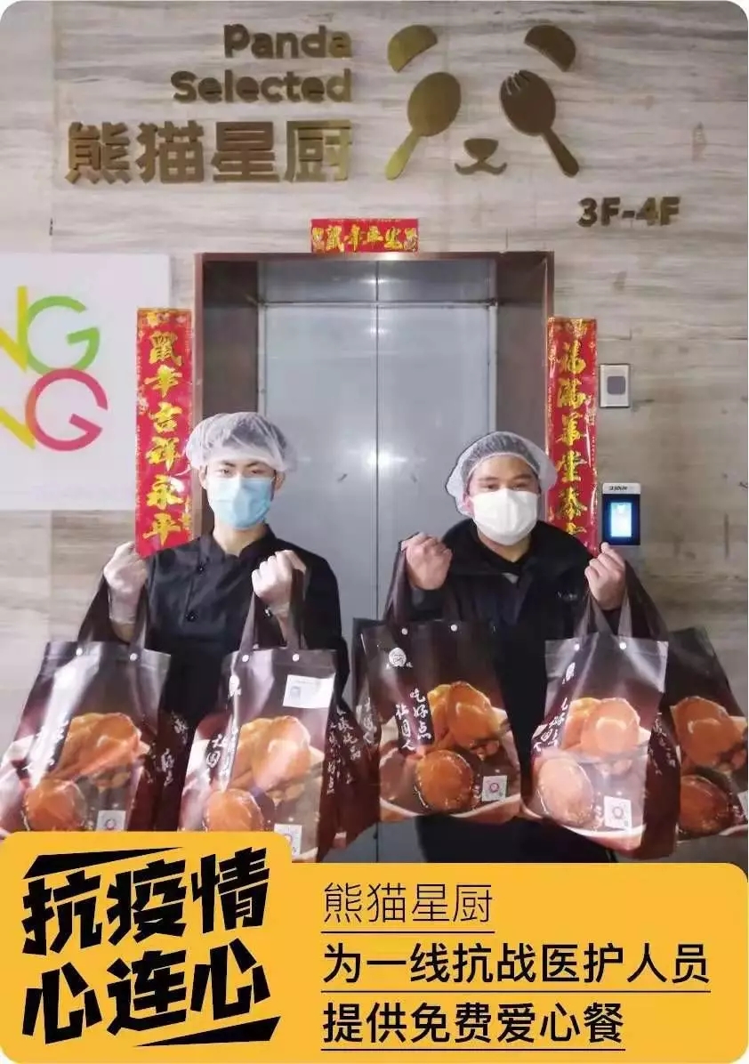 2月2日,熊猫星厨发布了“熊猫星厨为一线送餐计划”, 为发热定点医院医护人员送上爱心餐。自方案实施以来,已经先后为北京三甲定点医院,上海被医院隔离的外来人员酒店免费配送上百份安心健康的餐食。
