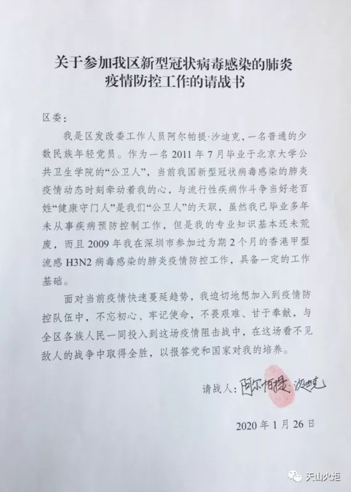 在乌鲁木齐高新区发改委担任规划科科长的北大公共卫生学院2011年毕业的阿尔帕提·沙迪克,一直关注疫情的发展,看到疫情一天天严峻,在征询了领导和妻子的意见后,毅然写下了请战书,决心不忘初心,牢记使命,到抗击疫情的第一线工作,加入到防控队伍中。他现在在高新区(新市区)疫情防控指挥部工作。