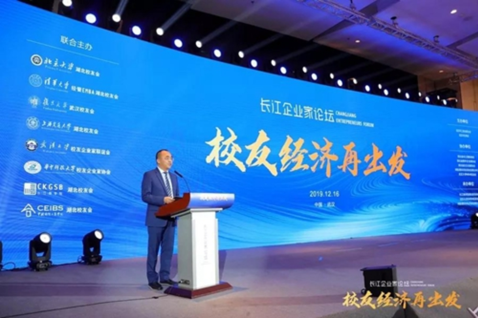 2019年12月16日,以“校友经济再出发”为主题的长江企业家论坛在武汉隆重召开。来自北京大学、清华大学、复旦大学、长江商学院、中欧商学院、上海交通大学等八所学校的800余位校友及企业家相聚一堂,共话校友经济,聚焦长江经济带发展。