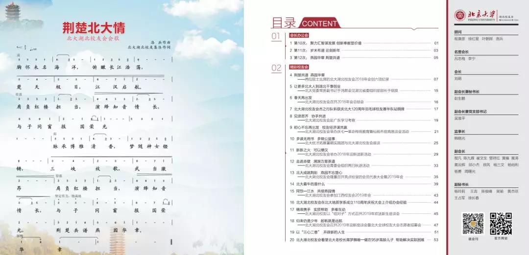 该期栏目由“会长办公会、精彩校友会、荆楚讲坛、教育沙龙、联大讲堂、荆楚北大人、荆楚校友行、公益北大人、未名诗社”九个板块构成,11万余字记录了北大湖北校友会近年来丰富多彩的美好瞬间和故事。在这里,您可以看到的不仅是校友会成长的心路历程,更是力透纸背的奋进铿锵,记忆和记载了几代人北大人在湖北当下最美的芳华。
