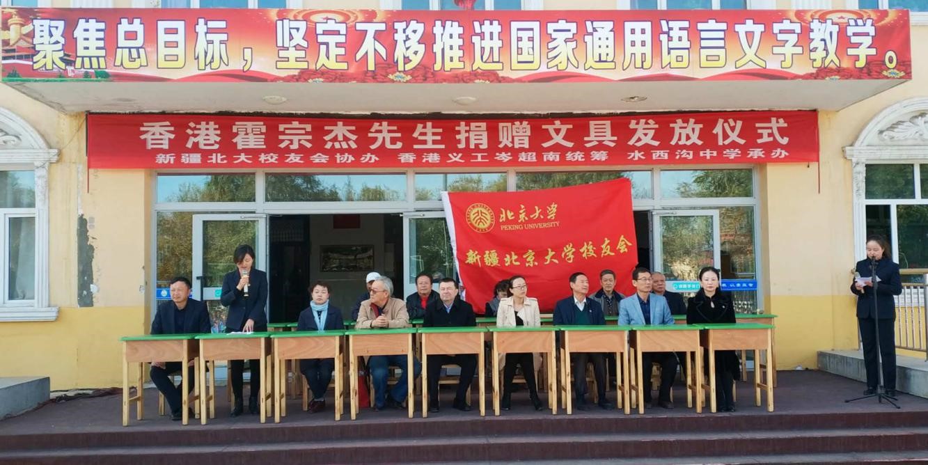 自2010年起,新疆北大校友会就极具组织地开展扶贫助学工作。2016年中央提出“决战脱贫攻坚”战略号召,上行下效,新疆校友会展开一系列的筹措,精心准备,有幸获得香港北大助学基金会和爱国企业家霍宗杰先生的款物支持。2018年至2019年10月,新疆校友会又从香港道德会、香港北大助学基金会、深圳狮子会、新疆红石慈善基金会等组织,引进各类善款共计567万元;发放御寒棉衣24000件,购置发放书包文具3425 (套)。156人获得敬老金、110人获得中学生助学金、99名大学生获助学金。以及北大贫困新生14名。