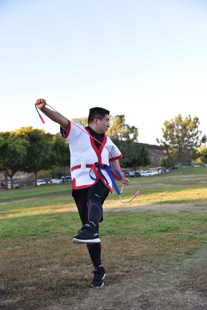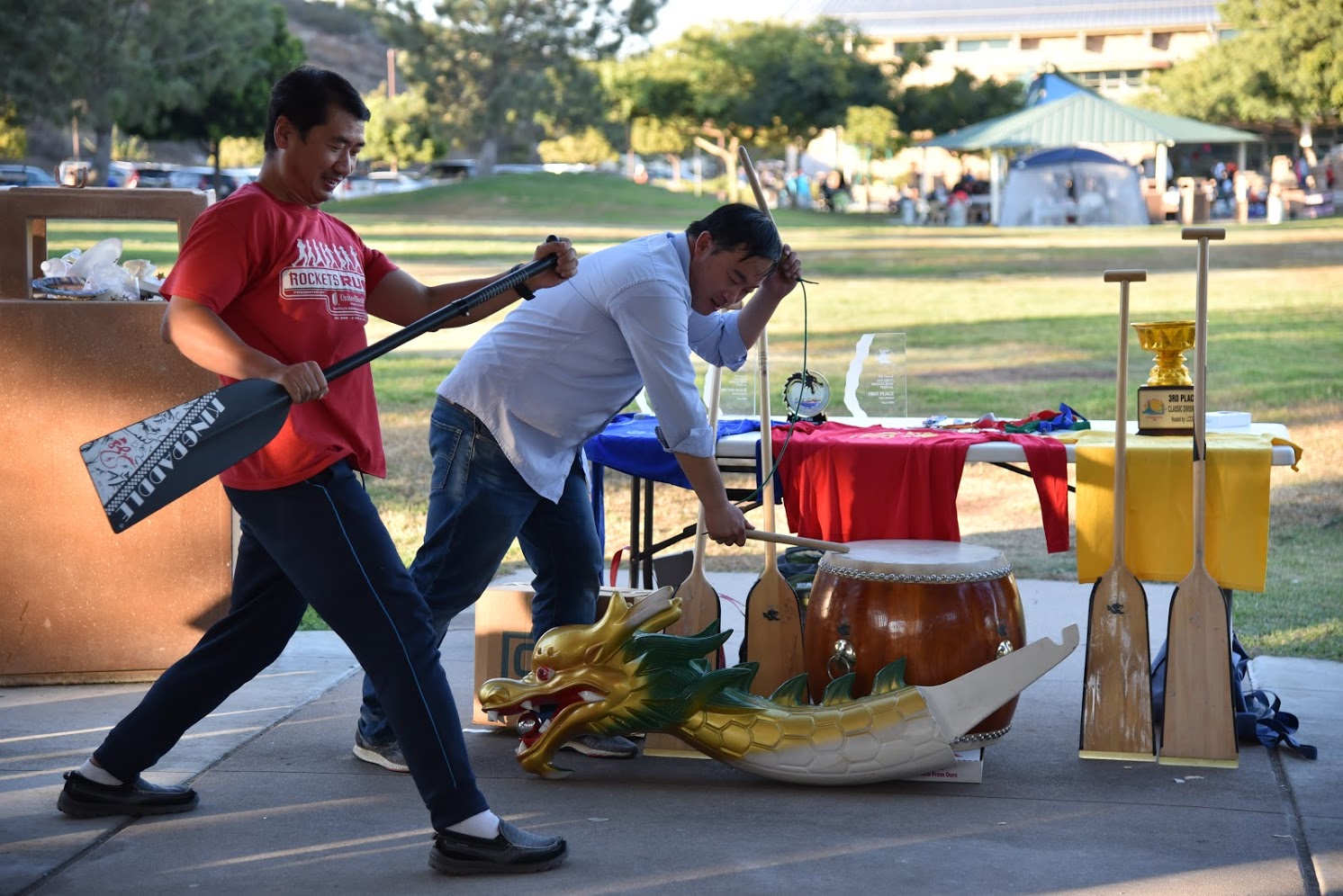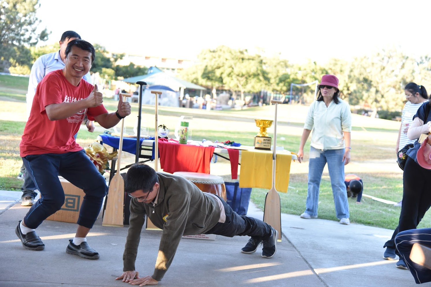 吃饱喝足之余,大家的目光汇集到圣地亚哥北大校友会五四龙舟队的特别展台,台前放有龙舟上的龙头,擂鼓以及船桨,桌上摆满自成立以来获得的多项奖杯奖牌以及队服。队长徐庆(93力学)为大家简单介绍了龙舟队的发展历程。教练赵瑨(94生物(研))为大家演示了划船的动作。为了增添大家对龙舟队以及健身的兴趣,赵瑨教练亲自示范了几个健身的高难动作,并邀请在场的校友尝试。而龙舟队的另一干将,也是本次烧烤的大功臣傅正校友则换上了摔跤跤衣,为大家演示了中国跤基本的上步踢,揣,和小袖穿腿等基本技术,赢得满堂喝彩。几位从未接触龙舟运动的校友当场表示了对加入龙舟队的兴趣。