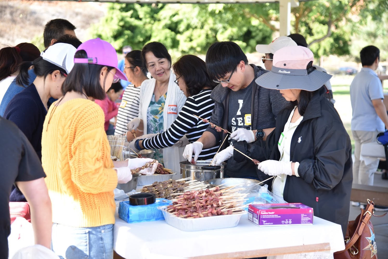 这次的野餐会采取了现场烧烤的形式,大家在阳光明媚的公园绿荫里享受了自己动手、丰衣足食的乐趣。傅正(00化学)校友在活动前一天花了三个小时,为野餐会的烧烤准备好了多达40磅的羊肉以及其他美味肉类。活动当天,校友们发扬了众人拾柴火焰高的精神,齐心协力生炉穿串,很快就烤制出了鲜嫩肥美、人见人爱的的羊肉串、鸡心、香肠等食物。几位坚守在烤炉前的校友发扬了先人后己的高风亮节,保证了活动全程每人都享受到了新鲜热乎的美食。在扑鼻肉香的催化下,校友们打开话匣子,或与老同学叙旧,或结识新交,言笑晏晏,不亦快哉。