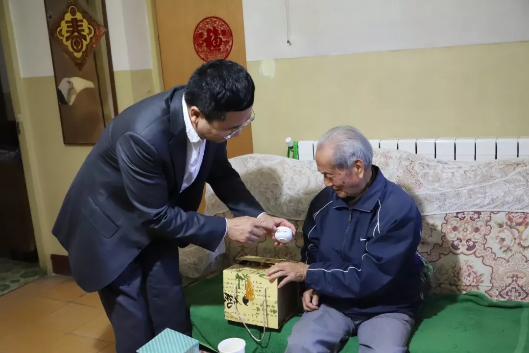 最后,刘萌会长还向蒋仁浩先生夫妇介绍了今年11月29日至12月1日在武汉召开的北大全球校友大会有关情况,邀请两位老人在身体情况允许的情况下出席大会,校友会还向蒋仁浩先生夫妇赠送了北大字样的瓷器茶具及东北大米等礼品。