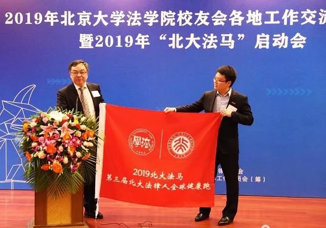 北大法学院文体工作委员会坚持“以体会友、以体强身、以体聚力”的精神,致力于为法学院校友打造形式丰富、品牌性强的嘉年华——“北大法马”。一方面,“北大法马”是增进校友联结与沟通的另一个“家”,另一方面也体现了北大法学院校友会希望各位校友关心身体、注意锻炼的拳拳之心。今年,“北大法马”将以赛中赛方式加入到“2019年长沙红色半程马拉松”,也欢迎各位校友踊跃报名参加。法学院院长、校友会会长潘剑锋教授代表法学院校友会授旗,王晓伟校友代表北大法学院校友会文体工作委员会(筹)接受授旗。