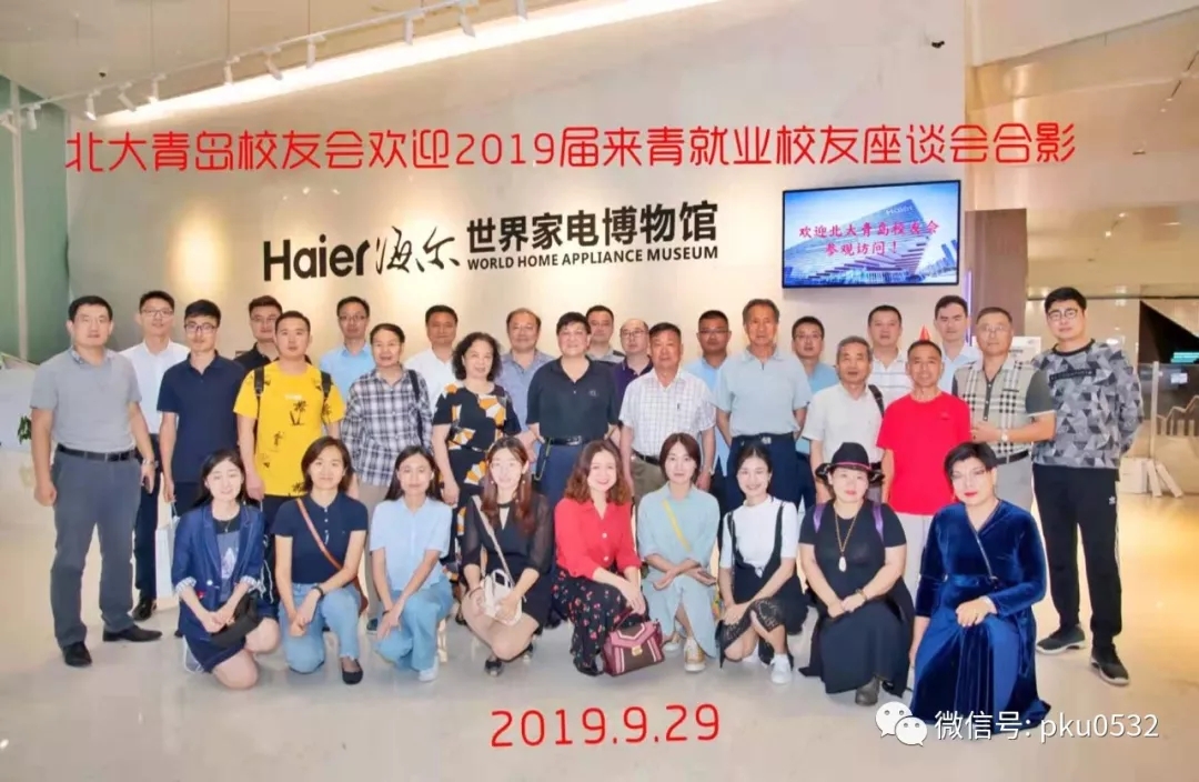 2019 年 9 月 28日 14时 30 分,北京大学青岛校友会在北京大学海尔世界家电博物馆会议室,成功举办了“欢迎2019届来青岛就业校友座谈会”暨“向祖国母亲70周岁生日献礼活动”。北大青岛校友会执行会长余勇,副会长侯传文、于毅祥,监事长邓云龙,老学长代表、前会长张培军,2019届来青就业校友,以及部分老中青校友代表等 40 余人全程参加了此次迎新活动。活动由张玉波副秘书长主持。