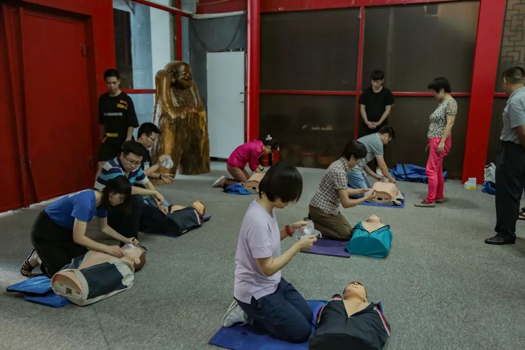 获得红十字会急救员证书的尤川川和彭颜红校友一起担任现场培训导师,他们结合模具,通过精准的动作和语言针对性的教学,带领校友进行反复实操,对心肺复苏中使用的仪器、标准的用语和手型及按压的次数时长等等,并全方位解答校友们提出的问题。