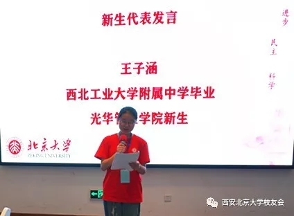 作为新生代表发言的是毕业于西北工业大学附中、被光华管理学院录取的王子涵。她说:“我们每一个人都有自己的成长故事,编织着与北大密密麻麻的情思。初识北大是爸爸口中全国最好的学府,小时候心里要强,只因为“最好”二字,便把北大立为目标;……在心里刻印下永不磨灭的人文北大。大抵也正是这最初的信念,鼓舞自己从安康到西安,再到北京,做出一个个改变自己的选择,去找寻那日渐清晰的北大身影。”