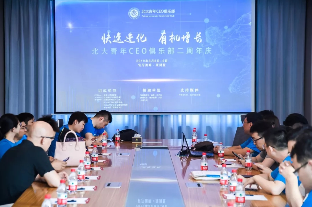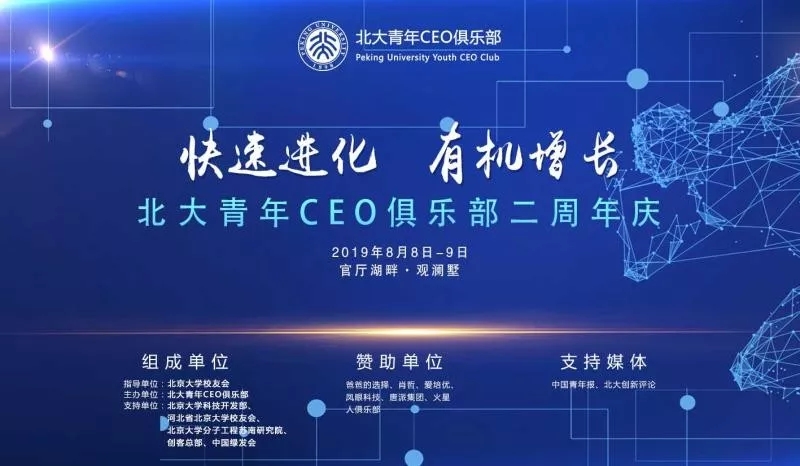 2019年8月8日至9日,由北京大学校友会指导,北大青年CEO俱乐部主办,河北省北京大学校友会、北京大学科技开发部、北京大学分子工程苏南研究院、创客总部、中国绿发会等单位大力支持,爸爸的选择、美因创始人肖哲、爱培优、凤眼科技、唐派集团、火星人俱乐部共同赞助,中国青年报、北大创新评论等媒体支持的“快速进化,有机增长——北大青年CEO俱乐部二周年庆”在官厅湖畔观澜墅举行。来自全国各地近150名校友嘉宾齐聚一堂,共庆北大青年CEO俱乐部二周年生日,在湖光山色中总结阶段性成长与得失,探讨企业发展“从0到1”之后的“快速进化”和“有机增长”。