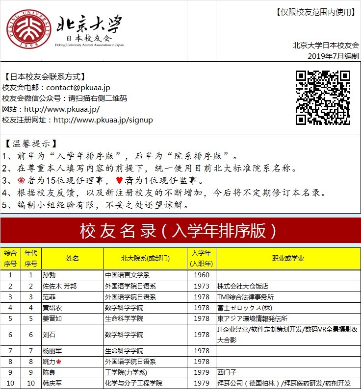 日本校友会于7月31日首次面向在日校友发布了《在日校友名录》。该名录收录了注册校友693人的姓名、入学年、北大院系,以及职业学业信息,并采用按入学年排序和按院系排序两种方式编制。