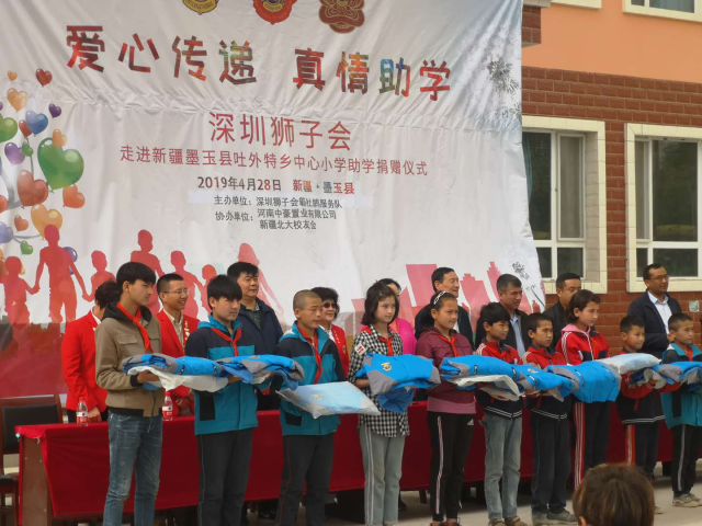 新疆维吾尔自治区北京大学校友会携手深圳狮子会簕杜鹃服务队为新疆维吾尔自治区高级人民法院驻村点——和田地区深度贫困县墨玉县吐外特乡中心小学的575名小学生赠送每人一套校服及其他体育用品,总价22万余元。