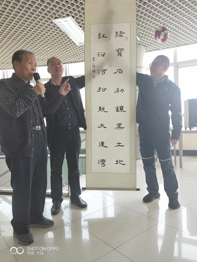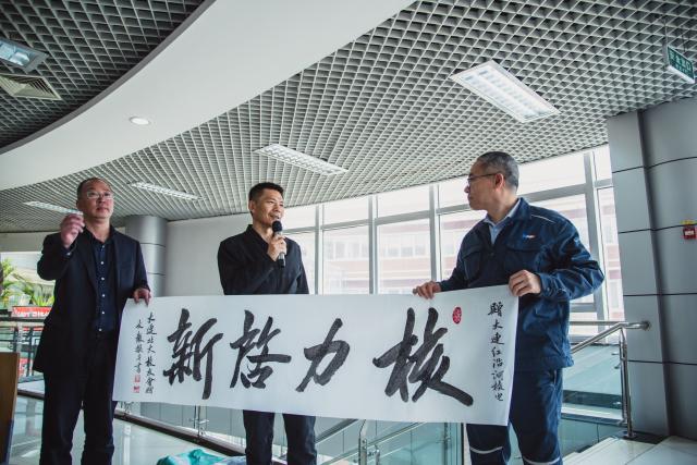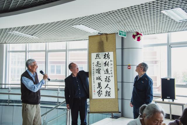中午章逸民总工代表公司及所有在公司工作的北大校友请大家在员工餐厅品尝工作餐,体验核电员工的日常。期间,原中科院大连化物所副所长92岁高龄的陈庆道校友、原39集团军党办主任贾瑞珍校友和中国书画家协会会员、著名书法家陆凡老师代表校友会向核电站赠送了自己的书法作品,向追求卓越、造福一方的核电建设者致敬。