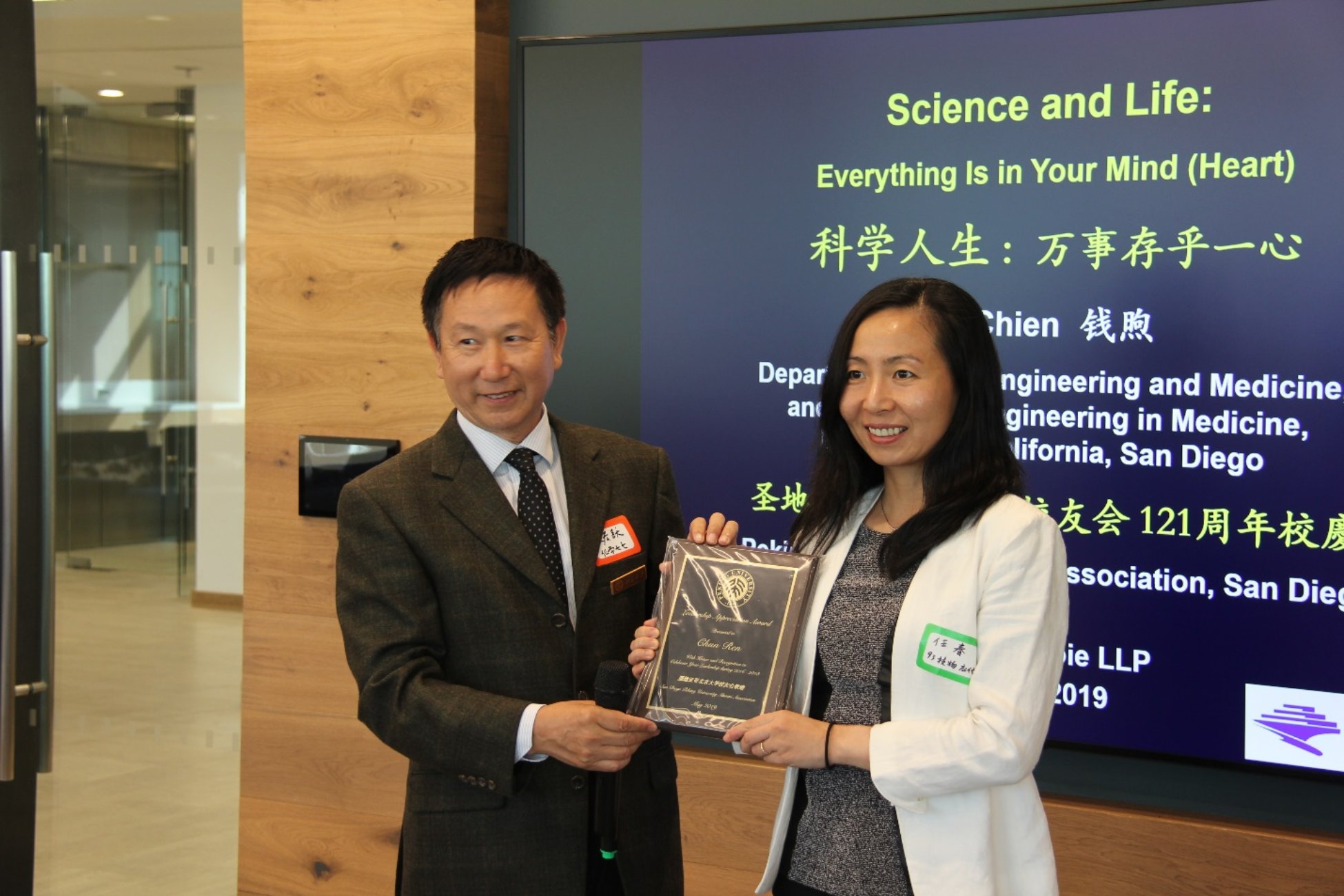 钱煦教授精彩的演讲多次赢得了在场校友的热烈掌声。演讲结束后,张宏跃理事长代表校友会给钱教授颁发了“”Distinguished Academic Leader Award“ (“杰出学术领袖奖”)以表彰他在科学,工程和医学上的杰出成就。钱教授表示他虽然接受过无数大奖,但最高兴的是能获得“家里”来的奖。随后,钱教授以抽奖的形式把签名的自传书《钱煦 Shu Chien: An Autobiography and Tributes at His 80th Birthday and Beyond》和《钱氏家训》》赠送给几位幸运的校友。部分校友还通过抽奖赢取了湘村人家的礼券和曾晶全州保险提供的精制的购物袋。