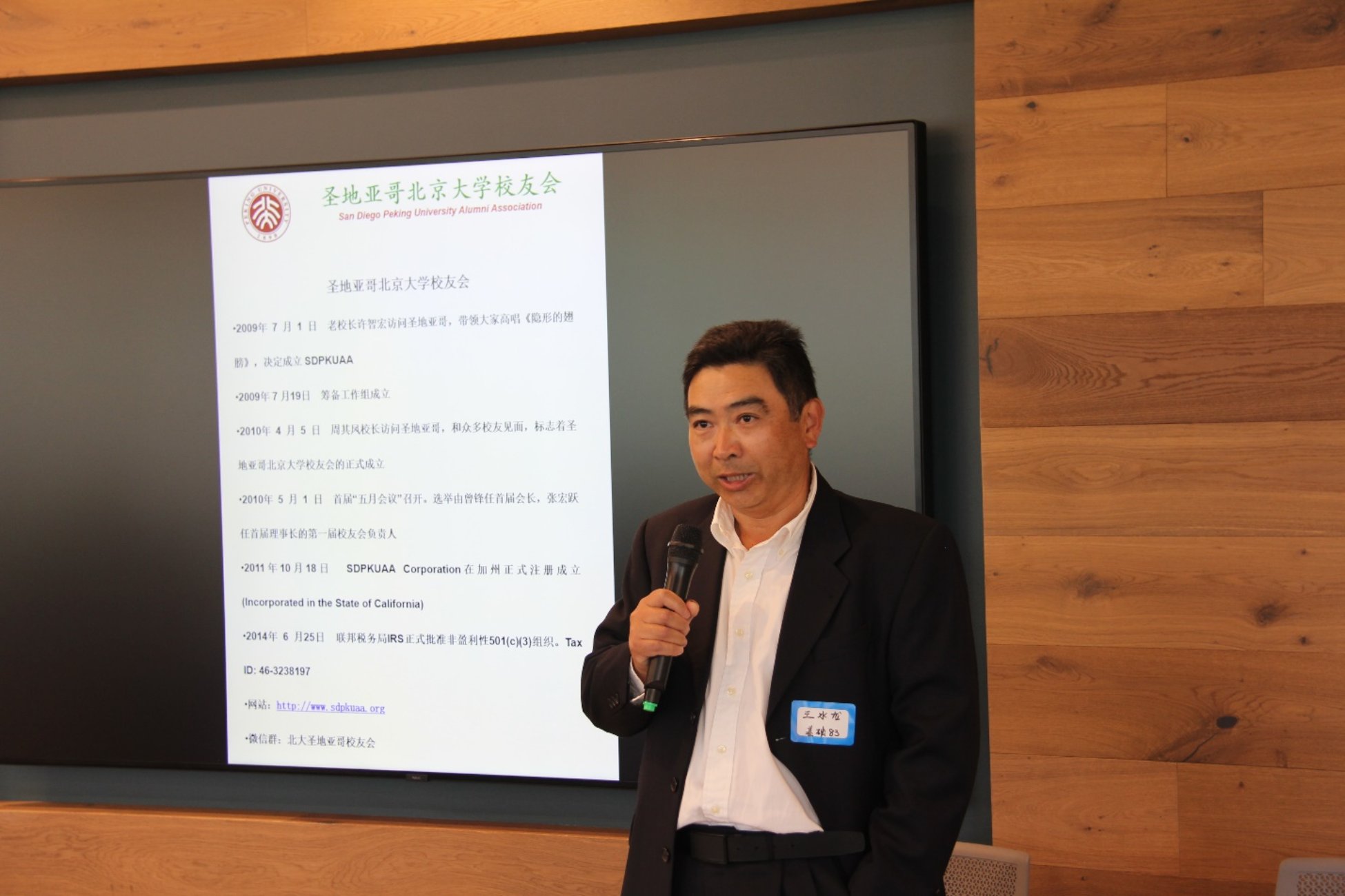 五月五日,北京大学校友会在Perkins Coie 侓师事务所举行了五月年会,75名北大校友及北大之友出席了本次年会。会长王水龙揭开了年会序幕,介绍了自2009年成立以来校友会的发展足迹, 过去一年间开展的活动, 历任会长以及现任理事会与执委会成员等情况。校友会理事长张宏跃为上任会长任春颁发校友会的领导奖,以表彰她自从毛遂自荐加入校友会,在过去几年为校友会做出的诸多贡献。