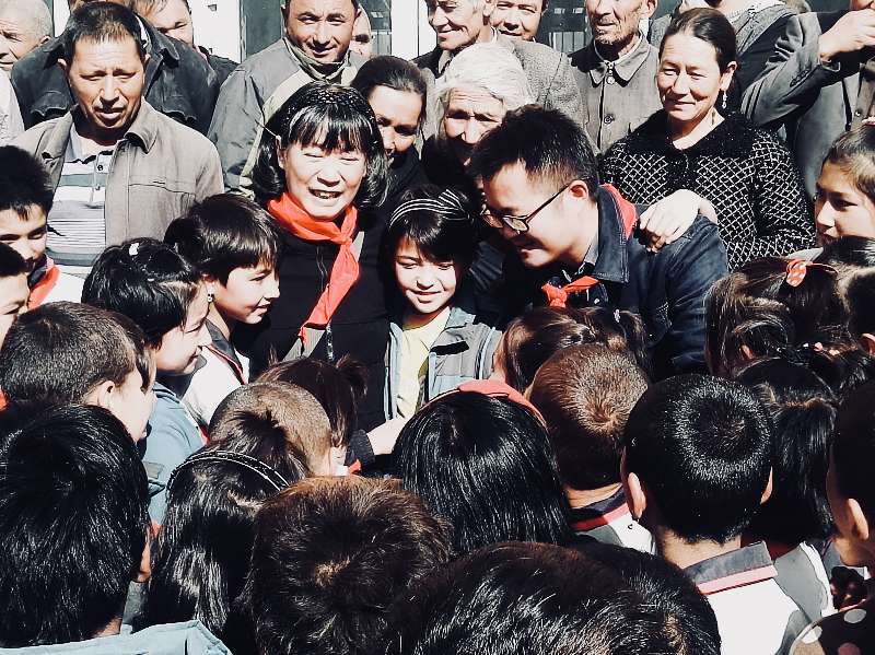 毕鹏(后排左一)在乡村给塔吉克小学生分发书包文具