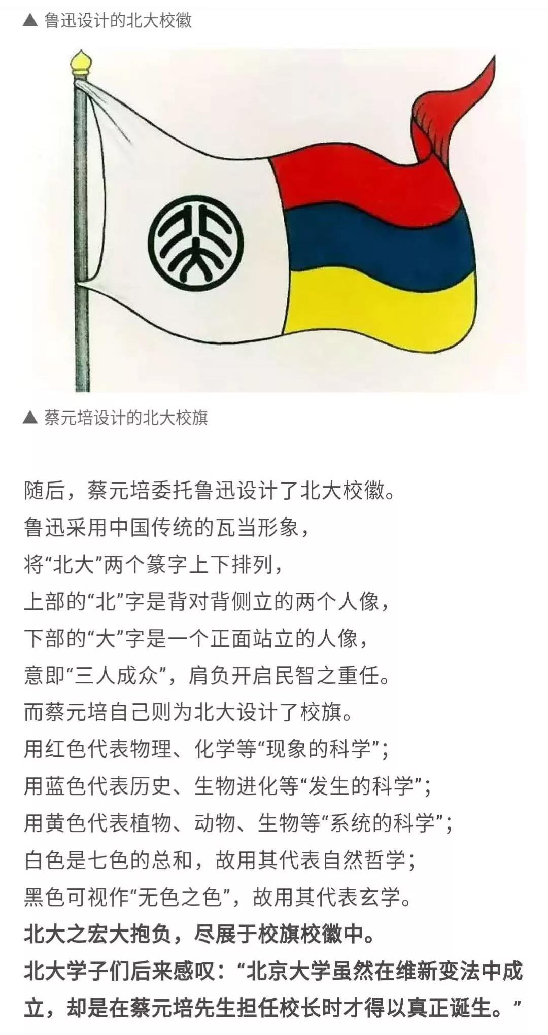 国立北京大学校旗由红白黄蓝黑五种颜色组成,所占面积,图形各不相同。其中校旗中含有白底黑色的北大校徽,校徽由鲁迅先生设计。蔡元培先生1920年在《国立北京大学校旗图说》中对北大校旗上的五种颜色,即红白黄蓝黑的意义做出过解释。