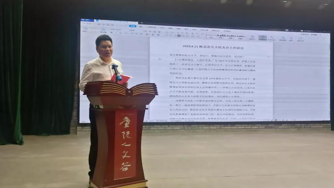 陈董代表江西仁达文化集团、江西庐陵人文谷旅游集团向与会所有嘉宾致以最热烈的欢迎。陈董谈到了人文谷集团总顾问黄小春是1978届北大才子,在他的引荐下,感谢北大江西校友会认同,感谢吉安市委、市政府认同,将这次北大校友联谊会放在吉安的公共人文休憩空间——庐陵人文谷召开,让各位北大才子能走进庐陵,走进老街,听取我们人文谷人复兴庐陵的梦想,感知我们人文谷人创新文化的使命。
