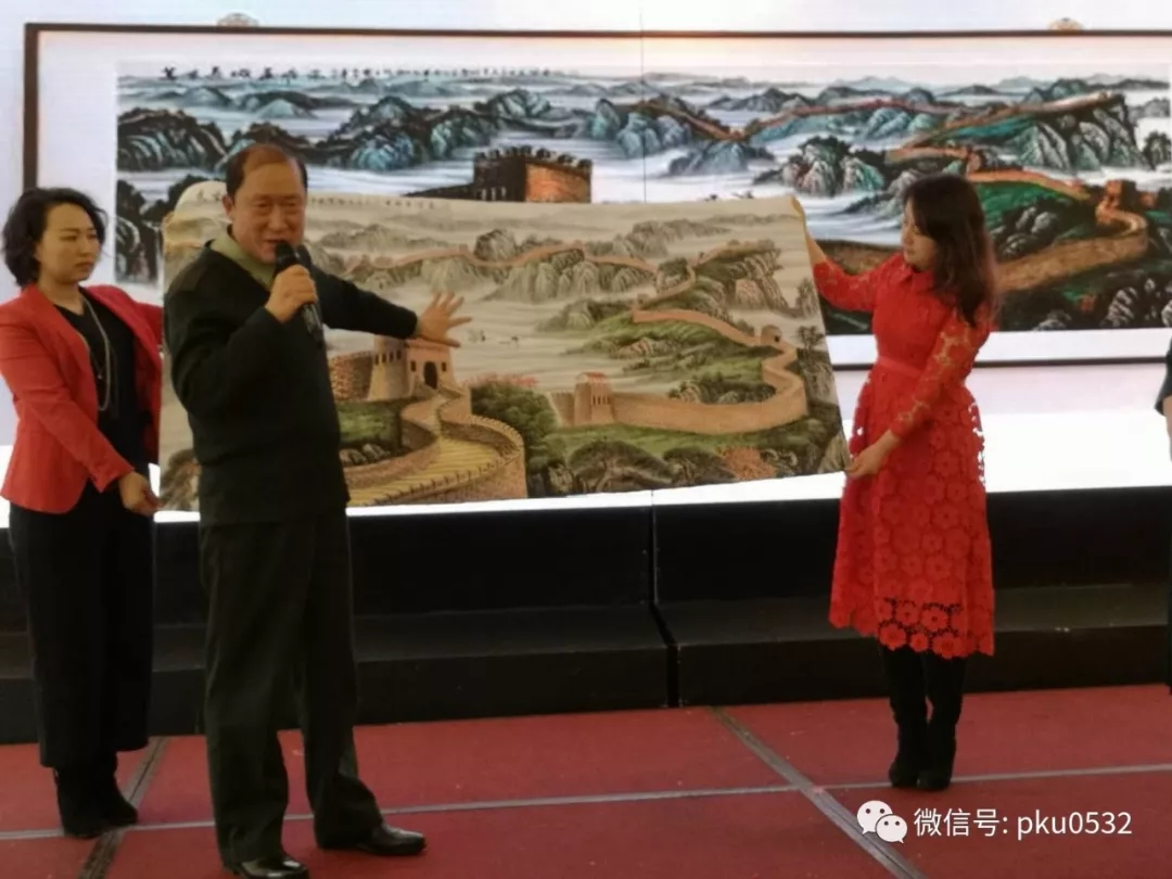 另外,鉴于著名军旅画家戴吉阳院长是个有大爱精神的北大之友,他去年捐出自己创作的国内唯一一幅夜光国画《财源广进》并进行了现场拍卖,拍卖所得向北大120周年校庆献礼;今年他又捐献一幅夜光国画《万里长城》,也进行了现场拍卖,并将拍卖款无偿捐给北大青岛校友会。对此经研究商议,决定同意给北大之友戴吉阳院长颁发荣誉证书。执行会长余勇、副会长于毅祥代表北大青岛校友会给戴吉阳院长颁发了荣誉证书并合影留念。