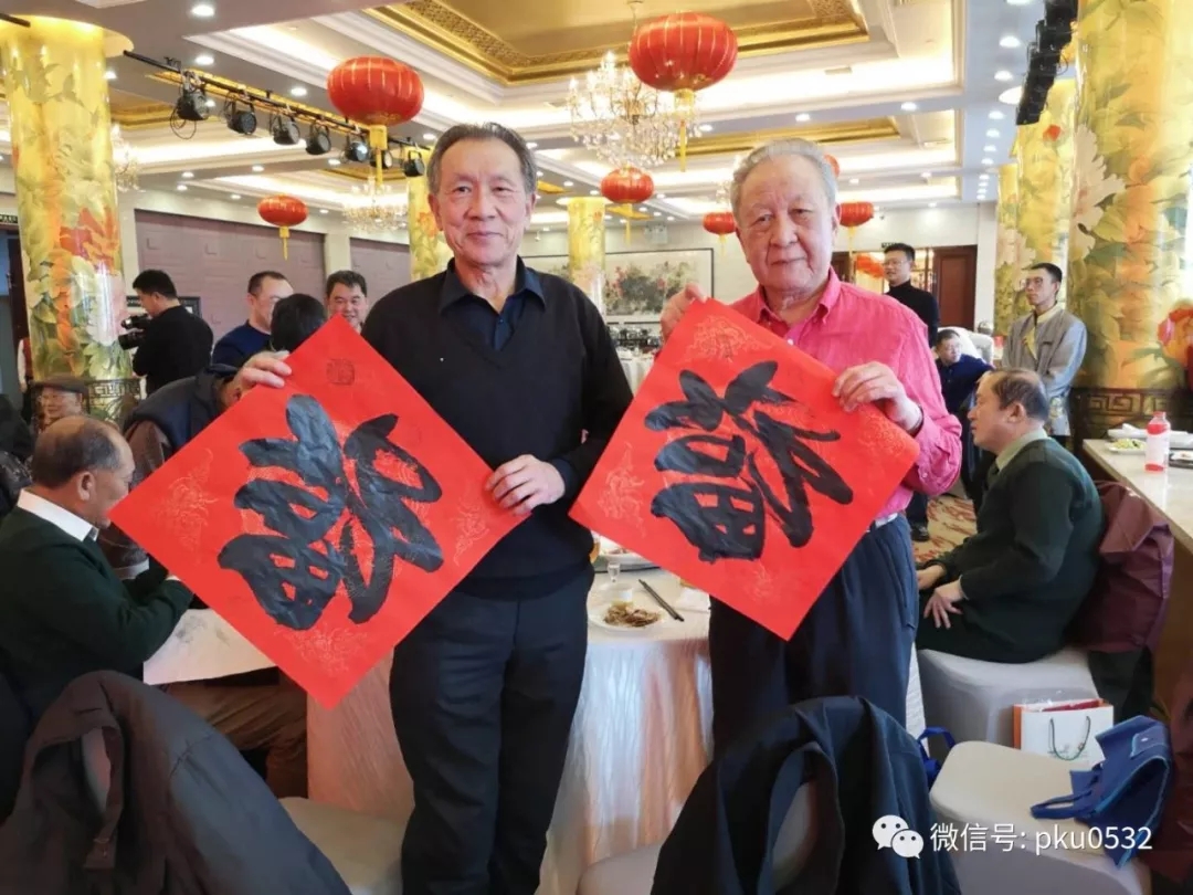 另外,反写汉字获毛笔、钢笔最快两项世界纪录的马玉春校友利用专业特长,在家写好反写的“福”字,向参会年龄最长者88岁的田吉莅老学长以及特邀嘉宾山东省北京大学校友会副会长兼秘书长梁守兰、副秘书长郑义凤、北大之友、著名军旅画家、陶瓷大师戴吉阳以及部分老学长代表进行了现场送福活动,又给联谊会增添了节日的喜气、福气和欢乐!