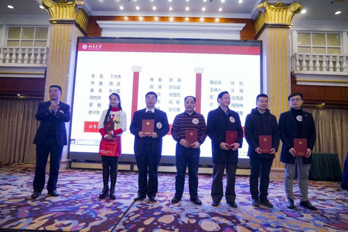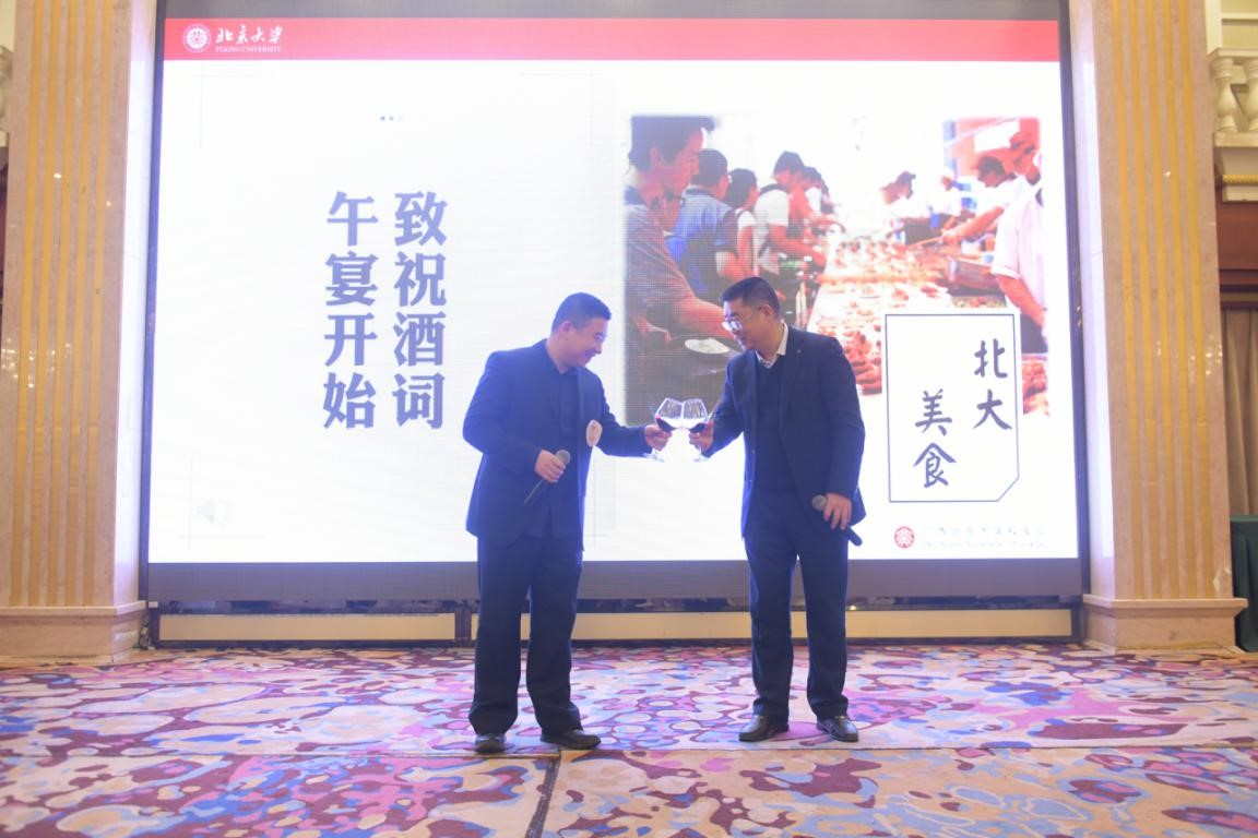 在精心布置的年会会场,北大元素无处不在,入口被装扮成古色古香的北京大学西门,场内还有巨型北大博雅塔、未名湖、图书馆的背景图,特别是精心打造的北大故事展墙,展示了北大建校的历史,引发了校友们的驻足沉思。随着全体校友合唱北大歌曲《燕园情》,年会拉开序幕。