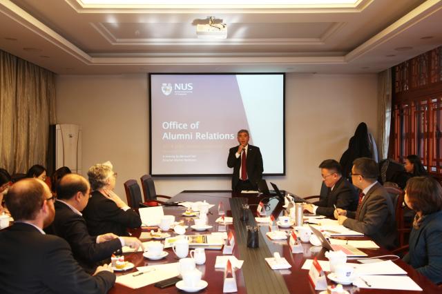 新加坡国立大学校友工作办公室主任Bernard Toh通过详细的数据资料介绍了新加坡国立大学校友工作发展现状,展望了未来五年校友工作的发展愿景,并就海外分会管理及未来校友关系维护等问题与与会成员进行深入讨论。