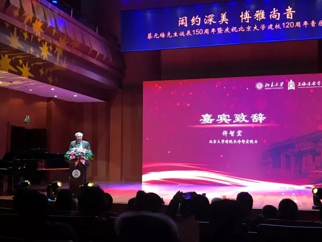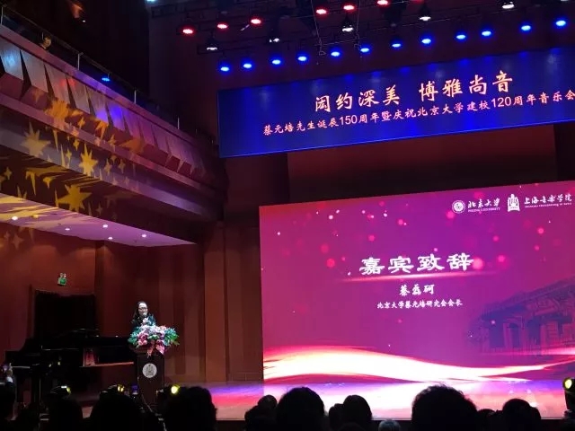 2018年12月23日上午,“闳约深美 博雅尚音”纪念蔡元培先生诞辰150周年暨北京大学建校120周年音乐会,在上海音乐学院贺绿汀音乐厅举行。北京大学原校长许智宏院士,上海音乐学院党委书记、院长林在勇,上海音乐学院党委常委、统战部部长、院办主任史寅,北京大学蔡元培研究会会长蔡磊砢,北京大学上海校友会常务理事张戟等领导专家,以及近七百名来自海内外的北京大学校友及上海音乐学院、清华大学等院校校友代表出席。
