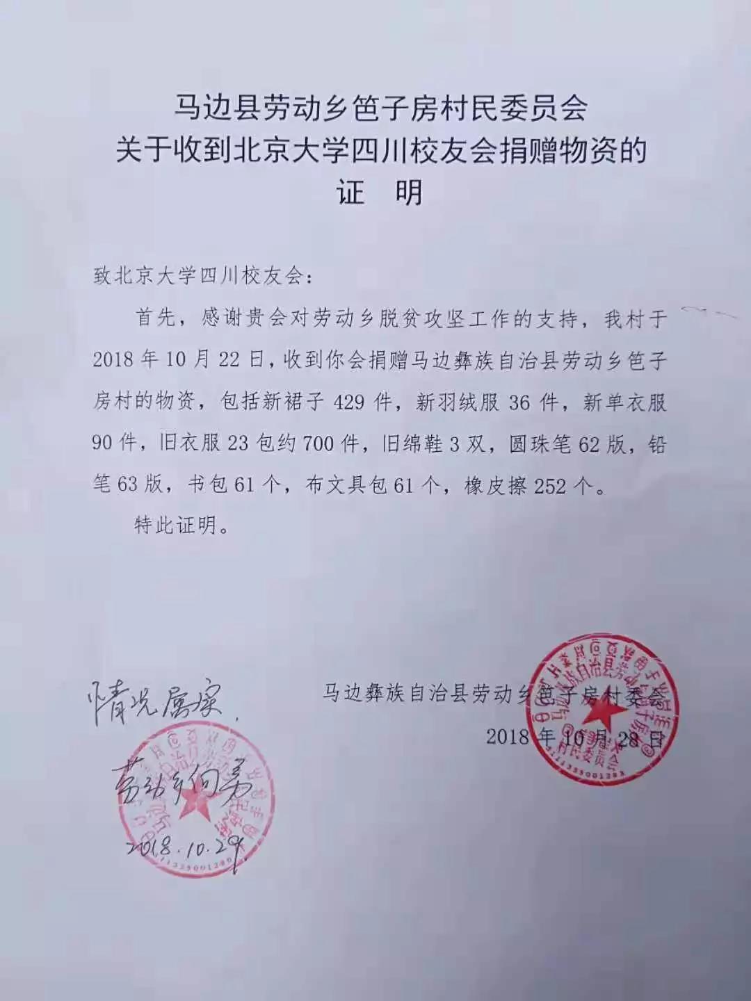据悉,马边彝族自治县劳动乡笆子房村属省级贫困村,全村均处于小凉山山地,海拔高、自然条件差。北京大学四川校友会一直关注并积极参与扶贫扶智工作,经中央纪委下派马边扶贫干部、95 级校友陈劲松等校友沟通,与马边彝族自治县劳动乡笆子房村取得联系。四川校友会广泛发动校友参与,收集并捐赠物资包括新裙子429件,新羽绒服36件,新单衣服90件,旧衣服23包约700件,旧棉鞋3双,圆珠笔62版,书包61个,布文具包61个,橡皮擦252个。这次活动大大激发了笆子房村小学孩子们的学习热情,点燃起了他们的理想火苗,也让笆子房村的贫困家庭得以温暖过冬。