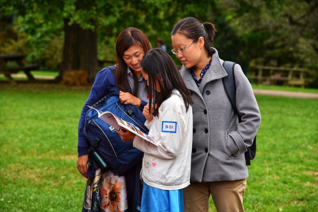 图三:张立英校友(左)、肖宇校友(右)同陈写意小朋友一道阅读匹兹堡北大校友会纪念120周年校庆专刊