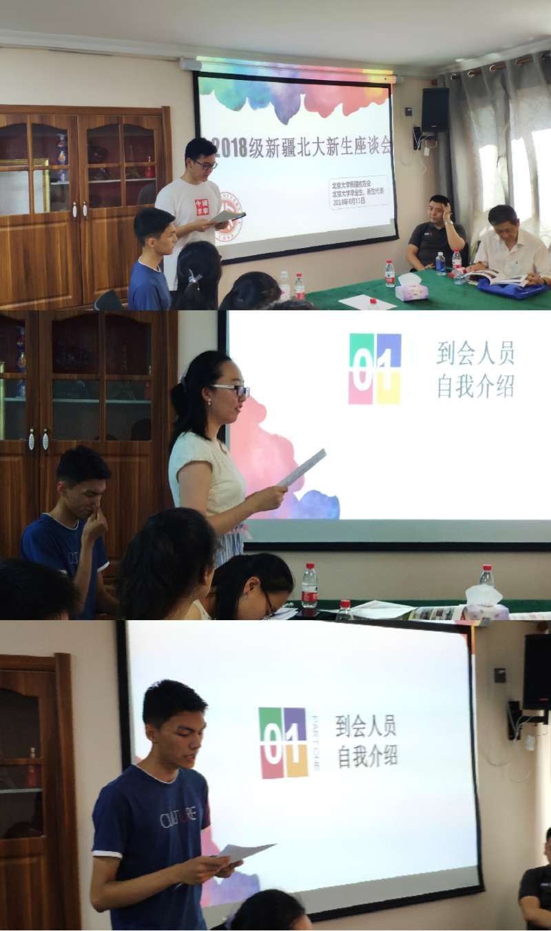 座谈会开始后,首先由到会的校友会领导和学长做自我介绍。他们是:颜肃副会长、聂宁副会长兼代理秘书长、李锺禄监事会主席、正厅级退休干部吴燕、胡琛副秘书长。本会副秘书长、新疆高校联席会议秘书长李俊章,作为赞助本次活动的新疆时速科教和新疆西典卓越企业的代表,也出席了会议。2018年7月毕业、已经回乡(来疆)工作的新闻与传播学院博士布玛丽亚木·买买提、新闻与传播学院硕士布尔兰·阿布勒哈孜、社会学系硕士赵代博也应邀参加。并且,来自乌鲁木齐地区10名北大入学新生代表也积极参加了座谈。各位校友会领导、学长们先后深情寄语,表达了对“不懈奋力拼搏,终于梦圆北大”的入学新生的热情祝贺和真诚欢迎!