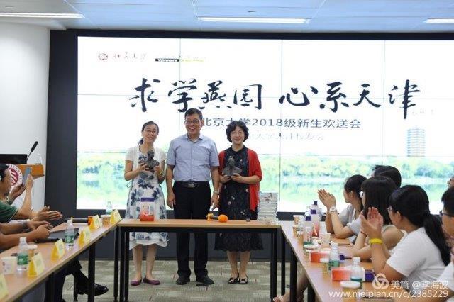 高会长继续讲到北京大学已经是一所具有中国特色的大学,从五四运动到共产党成立到中华人民共和国成立到改革开放到当今我们建设新时代具有中国特色的社会主义,没有哪所学校做到北京大学这般出现如此重要的革命家、领袖、科学家以及各行各业的优秀人才,所以北京大学一直是领先的。但是北京大学距离世界一流的前列、前十名还有一定差距,这些差距只能靠在座的新生来迎头赶上。新生们从今天走进北京大学,实际肩负着这样的历史使命,而这个使命不是个人的,而是国家的,是民族的,从踏入北京大学的这一天起,就已经与国家和名族的命运紧紧的连接在一起了。每年校友会都接待大量的回天津工作的校友,而这些校友都戴着北京大学的光环,这是社会人对北大人的期望。高会长嘱咐新生不要太在意成绩,成绩表明的是学习态度但并不是能力高低的表现。会长讲到天津校友会是北京大学地方校友会中第一个被评为优秀校友组织的,而且是天津市社团当中唯一的优秀的社团组织的校友会。天津校友会会继续坚持“思想自由 兼容并包”的精神,在天津营造一个北大的氛围,在以后组织的活动中,让大家继续享受北大的氛围。北京大学天津校友会永远是大家的精神家园,无论学成之后,是否回到天津工作,都希望大家认同这个家园。大家共同的努力把北京大学真正建设成为中国特色世界一流的大学,在建设中华民族伟大复兴的时代,发挥北京大学不可替代的作用。