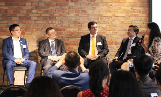 其后中德创新圆桌论坛开始,北大前副校长王杰教授、德国华为郭朝元校 友、蔚来汽车张晖校友和 KUKA 公司的Consumer Pobtics 副总Dominik Bösl 博士一起行了一个英语的圆桌会议,轻松愉快的讨论了创新、人工智能等话题,并深入探讨了如何更好地推动中德两国之间、大学和企业之间的创新与合作事宜。