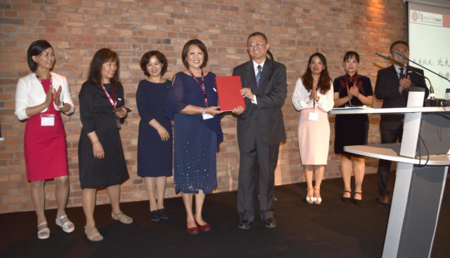 德国北大校友会会长于芳和理事会理事向北大校友会常务副会长王杰赠送留言簿