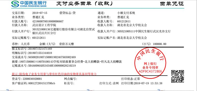 北大湖北校友会近年来发展势头迅猛,风清气正,校友们争着为校友会这个大家庭做贡献,涌现出有钱就“出钱”、有力就“出力”、有事就“出现”现象,在刚刚设立北大湖北校友会璞睿奖学金后不久,2018年7月18日,北大湖北校友会收到了程凡校友再次的捐款10万元,这是他连续第四年为校友会捐款,支持设立北大湖北校友会鹏程教育奖学金。
